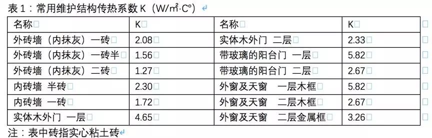 表1就是一些常用的傳熱系數(shù)數(shù)據(jù),比如說外磚墻,一磚也就是我們說的24墻,傳熱系數(shù)是2.08,而一磚半就是37墻,傳熱系數(shù)是1.56。從傳熱系數(shù),我們就可以很清楚地看出24墻和37墻的耗熱量上的差別有多大。一些常用的圍護(hù)結(jié)構(gòu)傳熱系數(shù),比如說外墻、中空玻璃等等,我們查了一次后可以記下來,下次要用到的時(shí)候就可以很方便、快捷地計(jì)算。