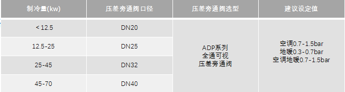 壓差旁通閥的安裝位置在主供、回水管旁通管上。規(guī)格選型如下: